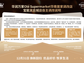 為給消費者帶來更優質、舒心的購物體驗,華潤萬家Olé Supermarket華南首家調改店——深圳寶能太古城店,將于12月1日起對門店進...